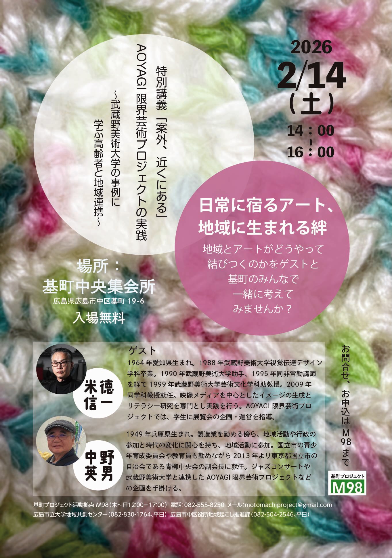 教員の活動|米徳信一教授_AOYAGI限界芸術プロジェクト特別講義 米徳信一教授が青柳中央会の中野英男氏と共に、2024年に実施されたアーツプロジェクト「AOYAGI限界芸術プロジェクト」の特別講義を行います。コーディネートは、本学科卒業生の平石ももさん(広島市立大学 非常勤特任教員)が担当されています。 日時:2026年2月14日(土)14:00~16:00 会場:基町中央集会所|広島県広島市中区基町19-6 運営:基町プロジェクト活動拠点M98 企画:広島市立大学 基町プロジェクト Prev 2025年度 武蔵野美術大学 芸術文化学科 卒業研究・制作展 / 大学院 芸術文化政策コース 修了展 Next 関連記事 2025年度 武蔵野美術大学 芸術文化学科 卒業研究・制作展 / 大学院 芸術文化政策コース 修了展 続きを読む 2025年度武蔵野美術大学 芸術文化学科 卒業研究・制作展 大学院 芸術文化政策コース 修了展 ... 助手の活動|「助教・助手展2025 武蔵野美術大学助教・助手研究発表」で芸術文化学科の助手が作品を発表します 続きを読む 助教・助手展2025 武蔵野美術大学助教・助手研究発表 研究室の一員である助教・助手は、本学... 芸術文化学科のプロジェクトが企画展「社会を縫合するクリエイティブ」で紹介されます 続きを読む 芸術文化学科のプロジェクトが、本学社会連携拠点1/Mの企画展「社会を縫合するクリエイティブ... ゼミの活動|熊川若狭芸術祭2025 関連企画|アートインスタレーション 景色のかけら 続きを読む アートインスタレーション・ワークショップ|景色のかけら 交易の拠点として栄えた若狭の宿場...